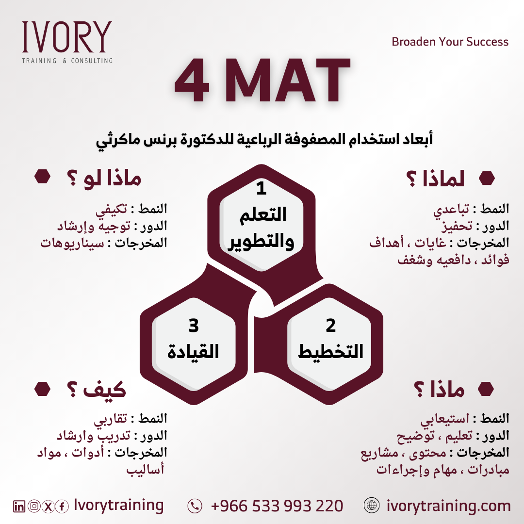 مصفوفة 4MAT هي أداة تطوير وتعليم فعالة تساعد في تحسين العمليات التعليمية والإدارية في مختلف الأطر التنظيمية والتعليمية. تم تطوير هذه الأداة بواسطة الدكتورة برنس ماكارثي، وهي تعتمد على نموذج كولب للتعلم التجريبي، وتركز على أربعة أسئلة رئيسية تسهم في تعميق الفهم وتحسين الأداء.